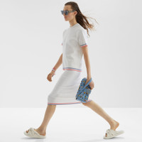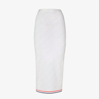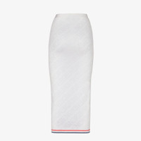Midi pencil skirt. Made of a white viscose knit, with all-over Fendi Mirror lettering intarsia in the same color. Embellished with a double sporty stripe on the background in pink and light blue. Made in Italy Composition: 56%viscose, 40%polyamide, 4%polyurethane Model height: 180 cm Size worn: 38 IT Product Code: FZQ719ANZEF0ZNM