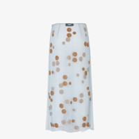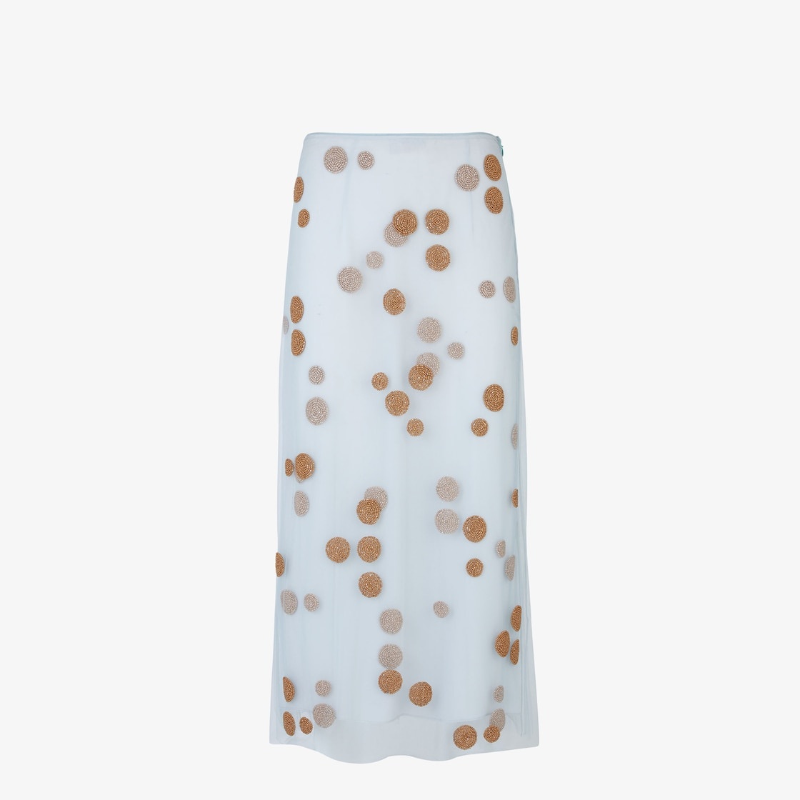 Straight-cut midi skirt. Side zipper closure. Lined. Made of lightweight, light blue tulle. Embellished with a large polka-dot motif all over, made up of a bead embroidery in various contrasting colors. Made in Italy Composition: 100% polyamide, lining: 100% silk, 2 buttons: mother of pearl Size worn: 38 IT. The model is 177 cm tall Product Code: FQ7595ARUUF1PNK