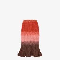 High-waisted midi skirt. Close-fitting and slightly flared at the hem. Made of a plated rib knit in a blend of mohair and wool. The multicolored gradient pattern in shades of pink and brown is inspired by an archive Fendi look presented on the catwalk in 1998. Embellished with contrasting Fendi Roma embroidery. Made in Italy Composition: 67% mohair, 30% polyamide, 3% wool Size worn: 38 IT. The model is 180 cm tall Product Code: FZQ994AYLTF1TIN