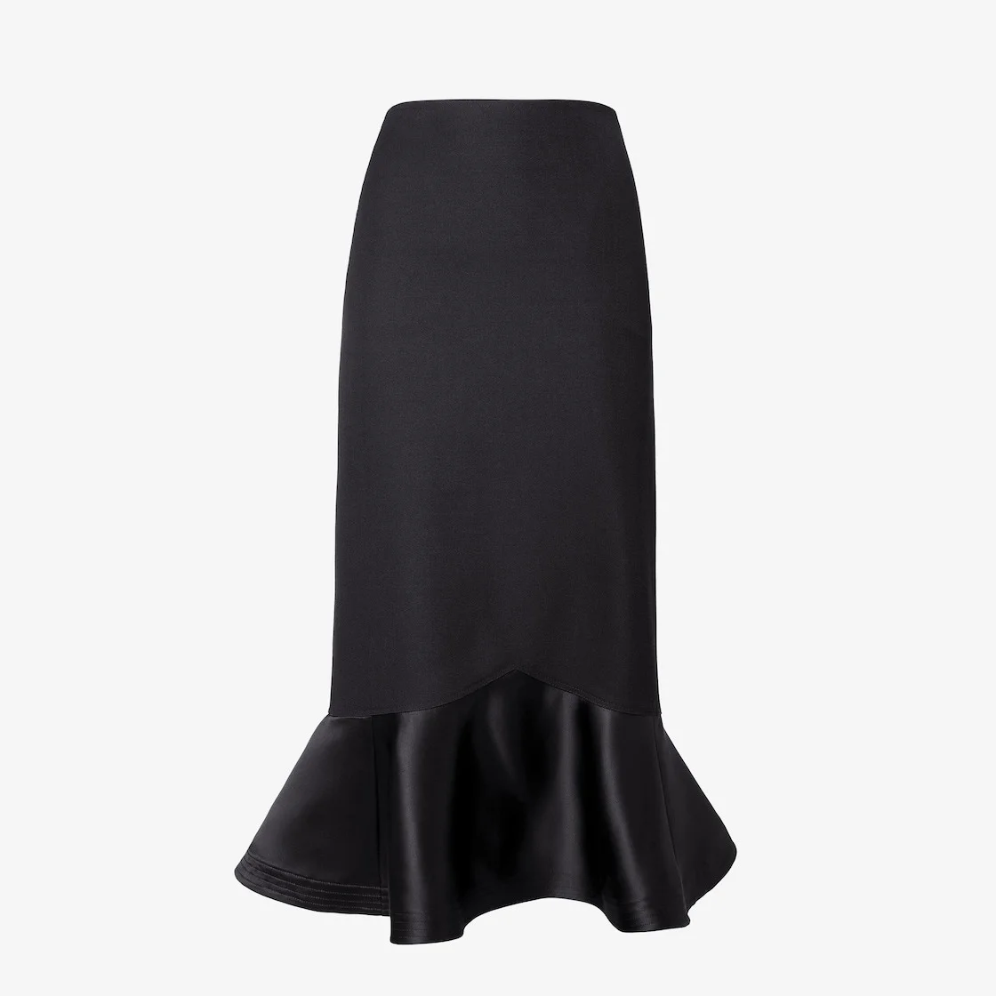 High-waisted midi skirt with a distinctive peplum silhouette, fitted at the waist and flared at the hem. Lined. Zipper closure. Made of black wool grain de poudre. Made in Italy Composition: 100% fleece wool, lining: 100% silk Product Code: FQ7687AJYFF0GME