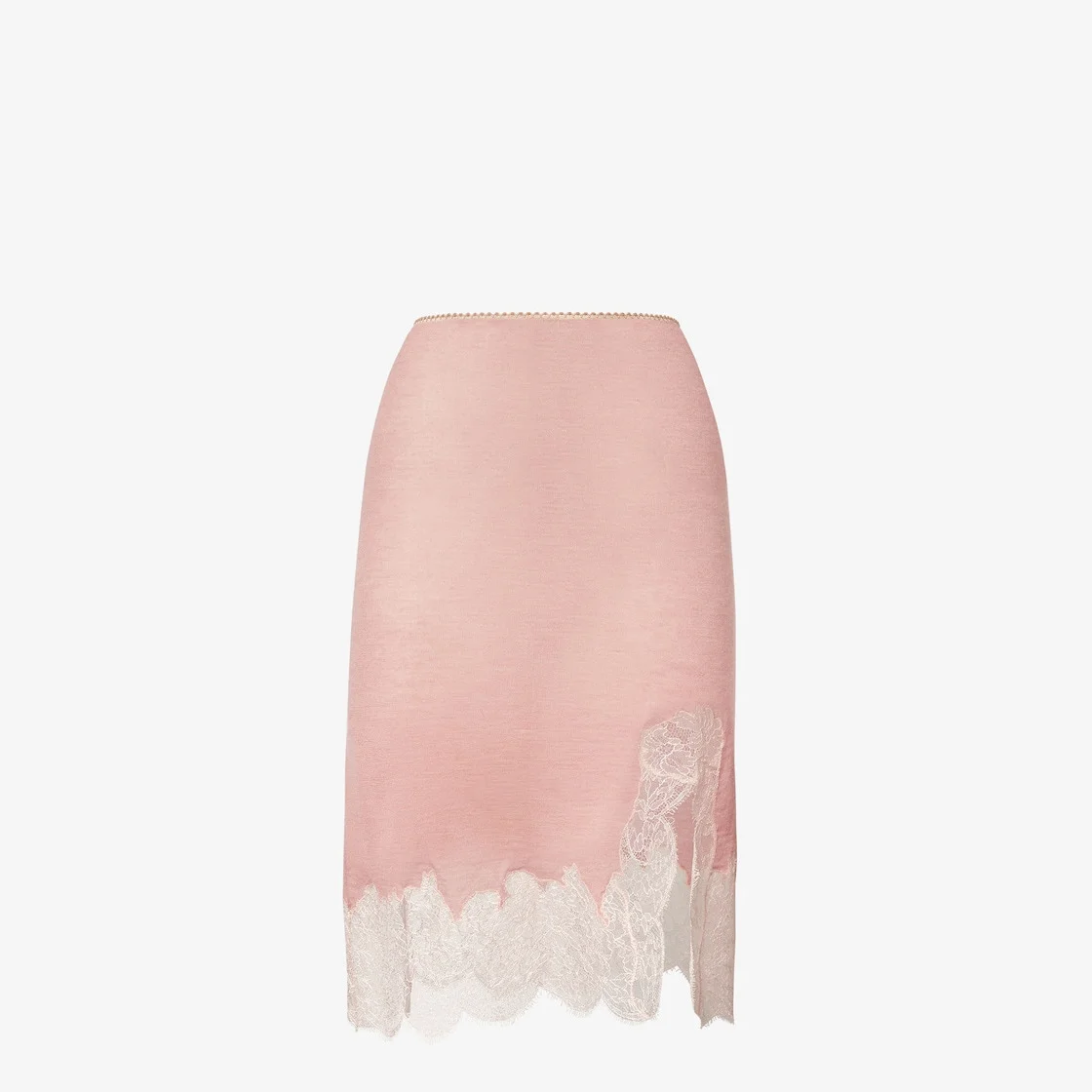 Short skirt with elastic waistband and a slightly flared silhouette. Made of lightweight pink cashmere and silk knit. Inspired by an archive design from 1968 and finished with a tone-on-tone lingerie-effect lace and tulle inserts. Made in Italy Composition: 51% viscose, 49% polyamide, 70% cashmere, 30% silk Size worn: 38 IT. The model is 180 cm tall Product Code: FZQ999AUZSF1T6N