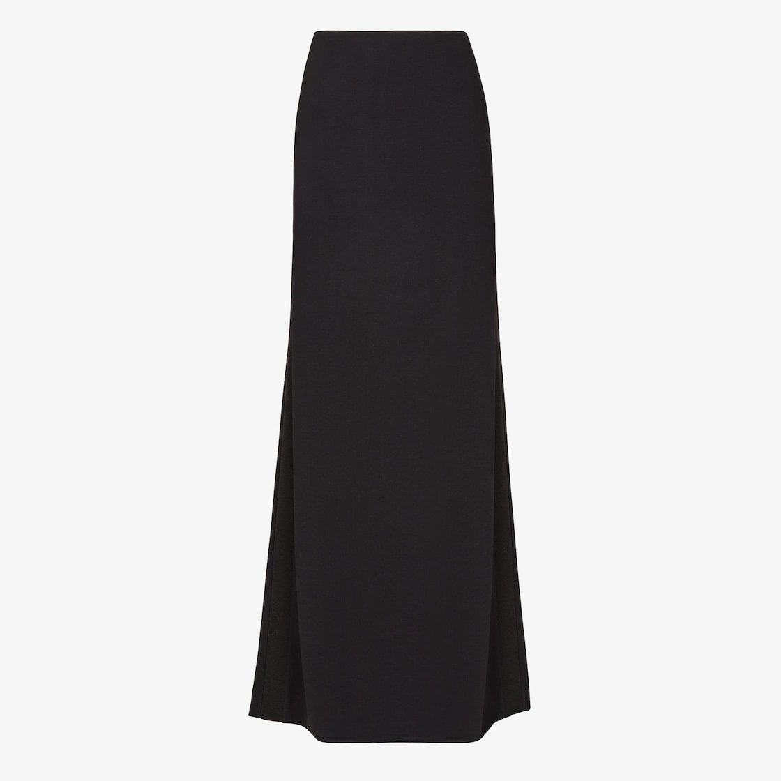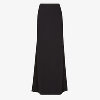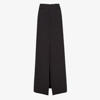 Long skirt with fitted waist and lightly flared line at the hem. Welt pockets and deep centre-back slit. Zipper closure. Made of black wool cady. Finished with black satin bands down the sides and contrasting embroidered Fendi Roma logo below the back right pocket. Made in Italy Composition: 96% fleece wool, 4% elastane Fit: Regular Size worn: 38 IT. The model is 179 cm tall Product Code: FQ7616ATNEF0GME