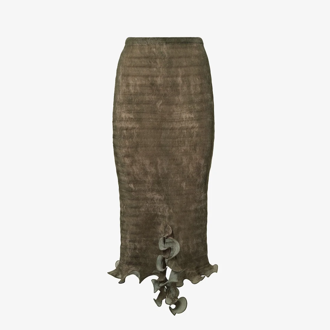 Midi pencil skirt with elastic waist. Made of pleated fabric with an abstract shaded olive green print. Finished with ruffles on the asymmetrical hem with a small central slit on the front. Made in Italy Composition: 100% polyester Size worn: 38 IT. The model is 180 cm tall Product Code: FQ7680AVJEF1T6G