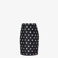Midi pencil skirt closed by a two parallel metal zippers on the front. Made in a black taffeta printed all-over with a contrasting color Falena Dots motif. Palladium-finish metalware. Made in Italy Composition: 100% silk, lining: 100% silk Product Code: FQ7715AVJQF0GME