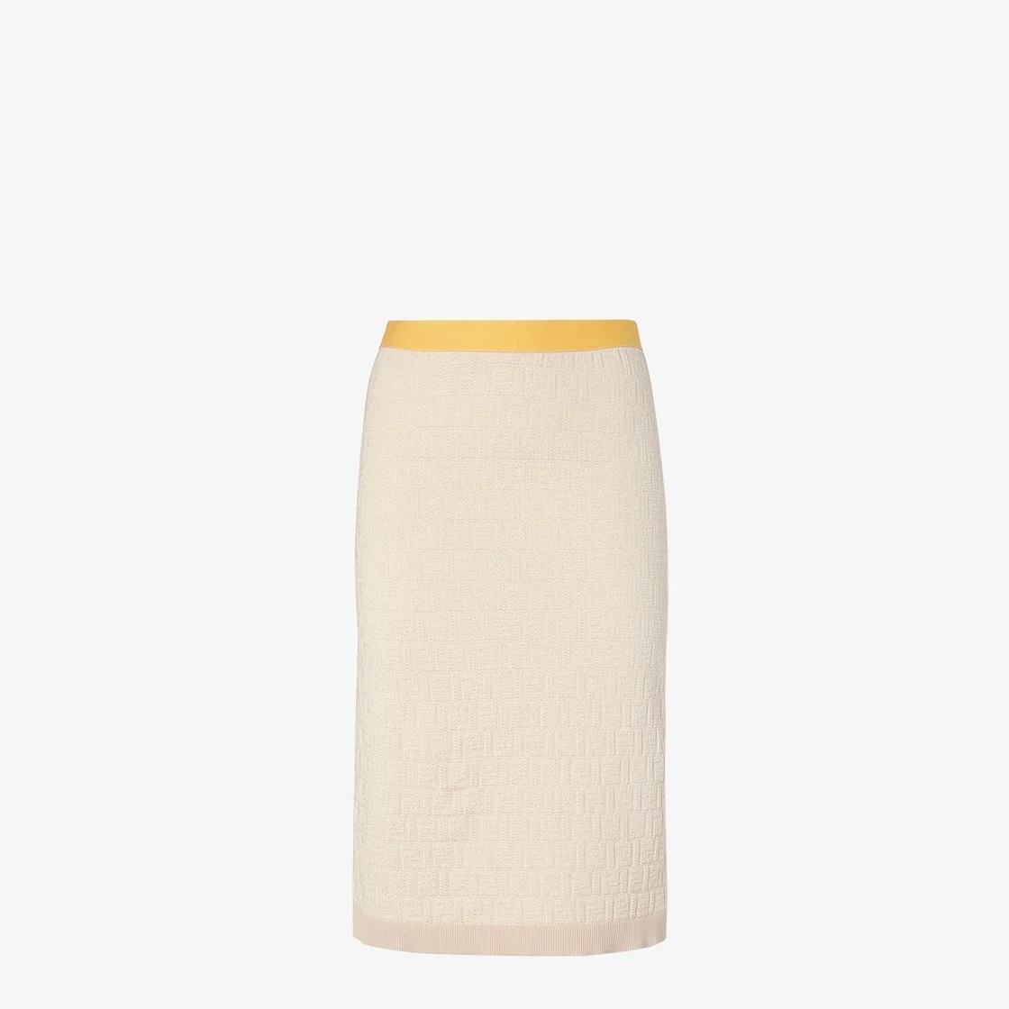 Straight midi skirt with stretch waist. Made of a beige cotton and silk yarn with the iconic FF jacquard motif all over. Contrasting color block inserts at the waist and sides in yellow and pink. Made in Italy Composition: 100% cotton, 100% silk Product Code: FZS031AW4SF0WC4