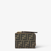 Baguette wallet with a compact and slim design, featuring an internal bill compartment, six card slots, an external zippered coin pocket and a long zipper pull decorated with an FF motif. Made of jacquard fabric with iconic FF motif. Trimmed with brown leather. Gold-finish metalware. Made in Italy Composition: 65% polyester, 35% cotton, 100% calf leather, inside: 53% polyamide, 47% polyester Product Code: 8M0519A98PF0A6E