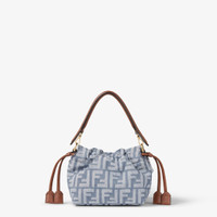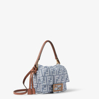 Iconic small Mamma Baguette bag, created in the late 1990s as a larger version of the iconic Baguette, hence the name Mamma Baguette. Updated for the Spring/Summer 2025 fashion show with a soft, deconstructed look while retaining the original elements of the bag. Made of jacquard fabric with the iconic FF motif in blue, embellished by the FF clasp with brown leather insert. Large internal compartment lined in denim-effect jacquard fabric, with drawstring closure featuring soft brown nappa leather ties and customized details. Featuring a front flap and magnetic clasp. Gold-finish metalware. The bag can be carried by hand or worn cross-body thanks to the brown nappa leather handle and shoulder strap, both detachable. Made in Italy Composition: 66% cotton, 34% polyester, 100% lamb leather, inside: 64% cotton, 36% polyester Product Code: 8BS105AV5WF1SXQ