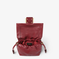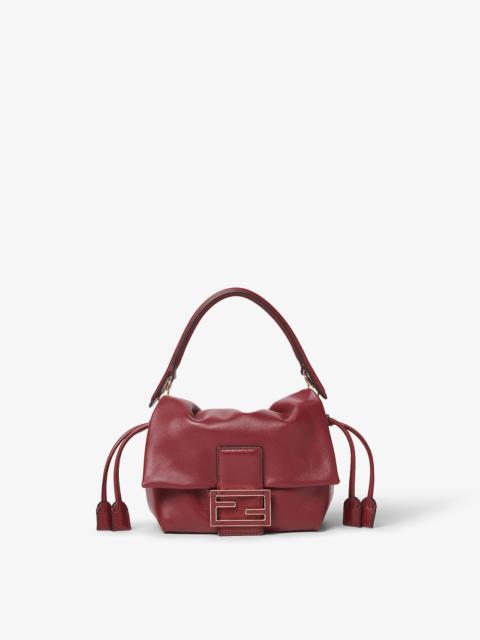 Iconic small Mamma Baguette bag, created in the late 1990s as a larger version of the iconic Baguette, hence the name Mamma Baguette. Updated for the Spring/Summer 2025 fashion show with a soft, deconstructed look while retaining the original elements of the bag. Made of soft, burgundy nappa leather, completed by an FF clasp with tone-on-tone leather insert. Large internal compartment lined in suede with drawstring closure, with tone-on-tone leather laces and customized details. Featuring a front flap and magnetic clasp. Gold-finish metalware. Can be carried by hand or worn cross-body thanks to the handle and shoulder strap, both detachable. Made in Italy Composition: 100% lambskin, inside: 100% calfskin Product Code: 8BS105ABVEF0YPU