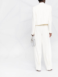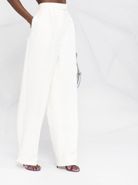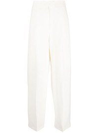 straight-leg high-waisted trousers off-white silk-wool blend straight leg high-waisted two diagonal pockets to the sides Made in Italy Composition Outer: Wool 77%, Silk 23% Lining: Silk 100% SIZE & FIT Model measurements Height 5 ft 10 in(1.77 m) Bust/Chest 32.28 in(82 cm) Hips 35.03 in(89 cm) Waist 25.19 in(64 cm) FittingInformation This piece fits true to size. We recommend you get your regular size Designed to be fitted at the waist and hips, loose over the leg Made with a mid-weight non-stretch fabric Washing instructions Dry Clean Only