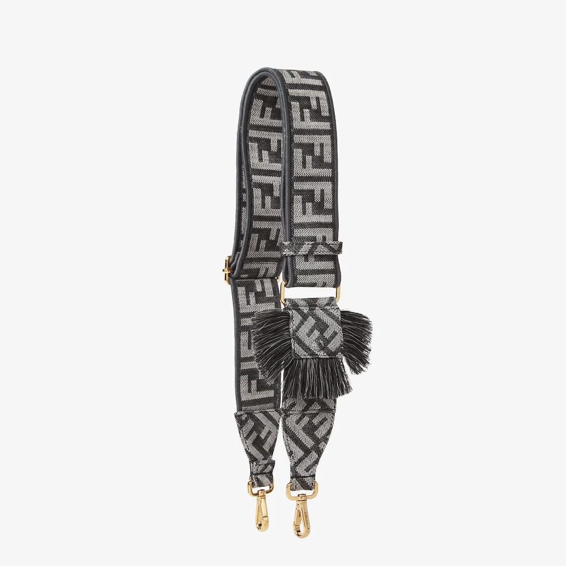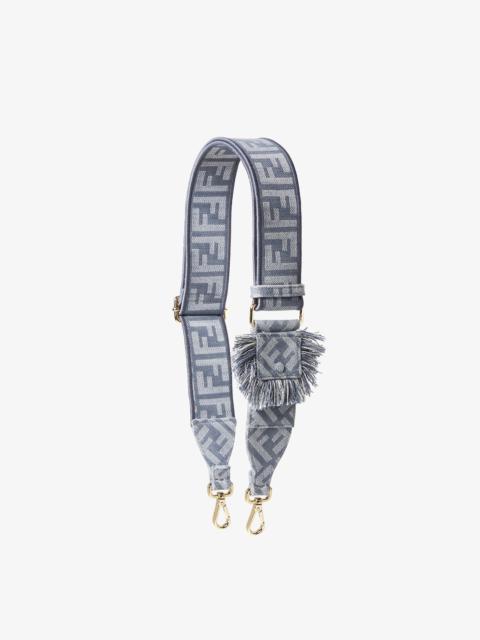 Long adjustable shoulder strap with double clip, to use in combination with any bag with hooks. Made in a dark blue, denim-effect FF jacquard. Small functional pocket with fringes. Gold-finish metalware. Made in Italy Composition: 56% polyester, 40% cotton, 4% elastane Product Code: 8AV925AV4SF0KUR