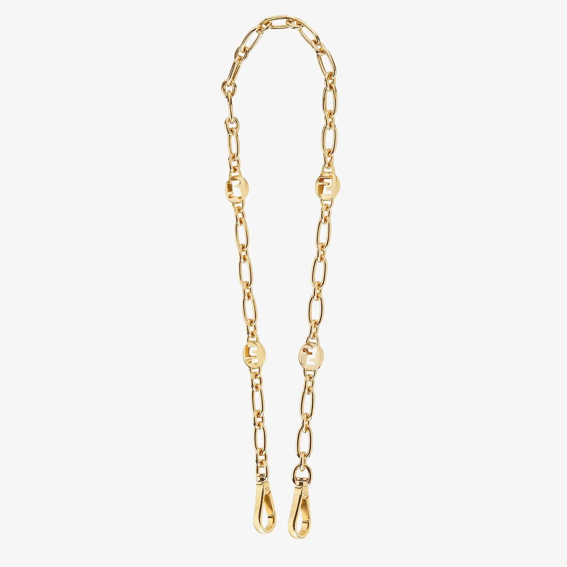 Long chain shoulder strap with double snap hook, to use in combination with any bag with hooks. Made of gold-finish metal embellished with four Fendi Sphera logo elements. Made in Italy Composition: 100% brass Product Code: 8AV960NQ9F0CFK