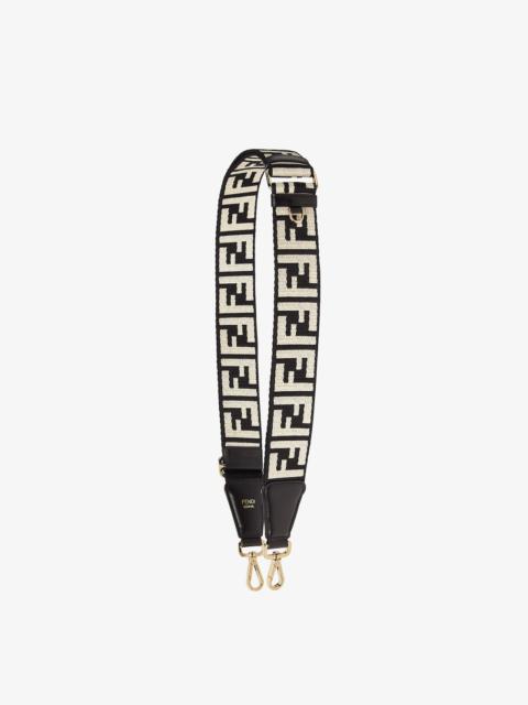Long adjustable shoulder strap with double clip, to use in combination with any bag with hooks. Made of beige webbing with multicolored iconic FF jacquard motif. Finished with cappuccino-colored leather details. Gold-finish metalware. Made in Italy Composition: 50% polyamide, 50% polyurethane, 100% calfskin Product Code: 8AV386AUS6F1V02