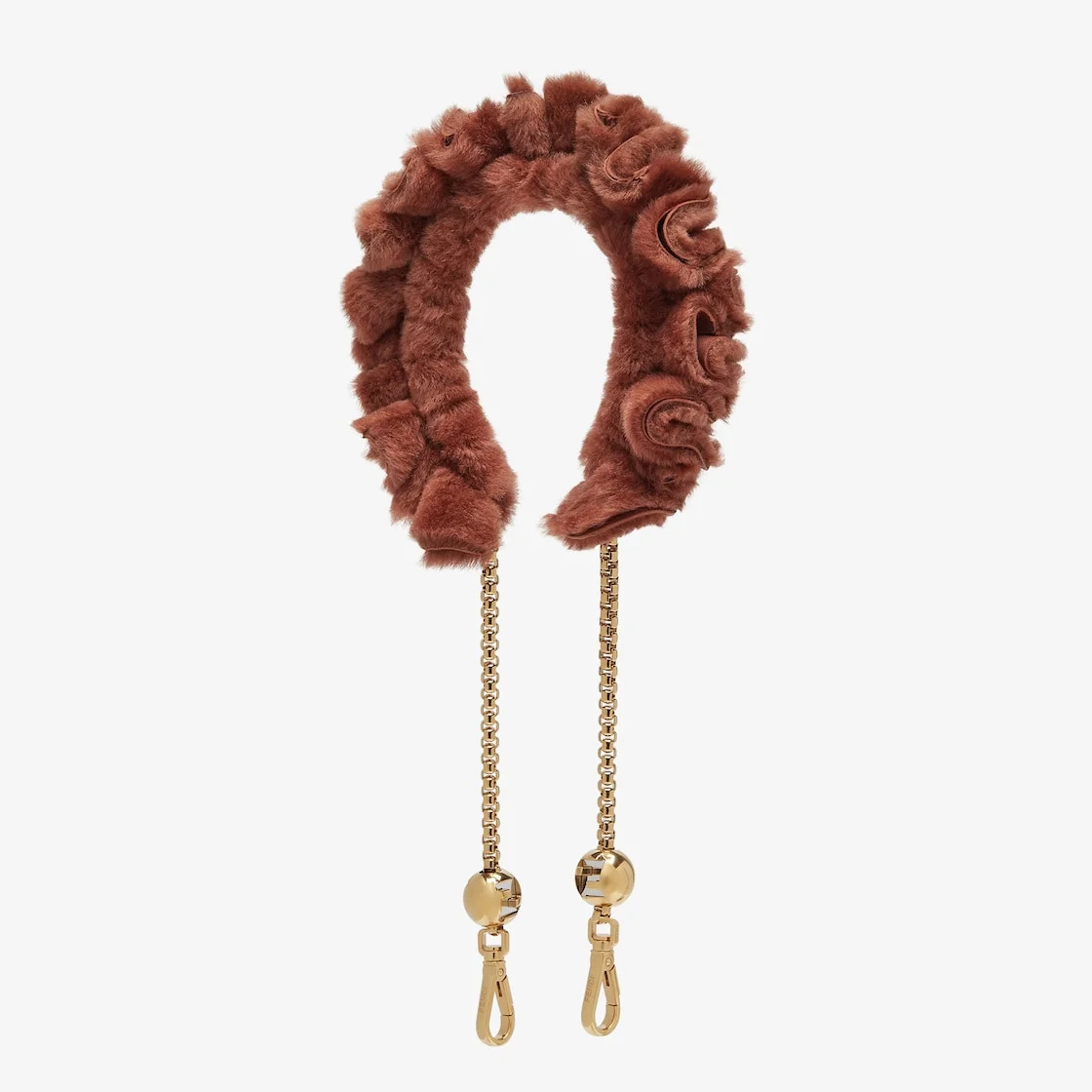 Shoulder strap with double snap hook and Fendi Roma logo, to use in combination with any bag with hooks. Made of Venetian chain and brown shearling, gathered to create a ruffle effect. Finished with Fendi Sphere metal balls. Gold-finish metalware. Made in Italy Composition: 100% ram fur Product Code: 8AV961AVN7F1C6J