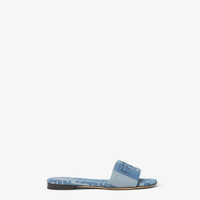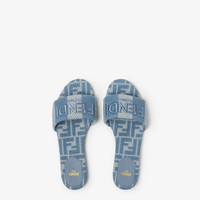 Wide-band slides. Made of denim-effect jacquard with Pequin stripes in shades of light blue. Denim jacquard insole with the iconic FF motif in the same shades. Light blue yarn Fendi Roma embroidery. 10 mm (0.4 inch) heel. Made in Italy Composition: 100% cotton, inside: 100% calf leather Product Code: 8R8092ASB5F1STD