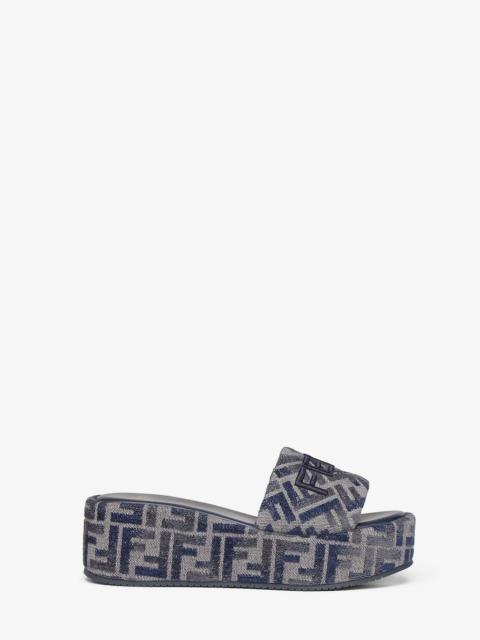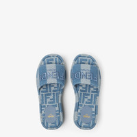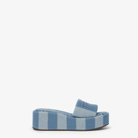 Wide-band slides with a platform sole. Made of denim-effect jacquard with Pequin stripes in shades of light blue. Denim-effect FF jacquard FF insole in the same tones. Light blue yarn Fendi Roma embroidery. Made in Italy Composition: 100% cotton, inside: 100% calf leather Product Code: 8R8515ASB5F1STD