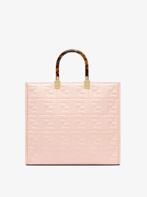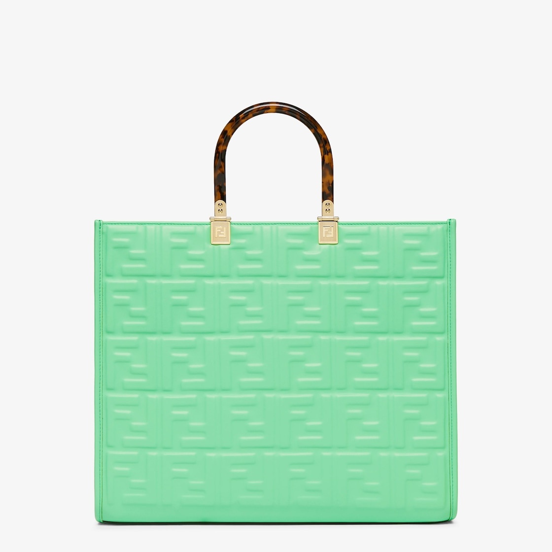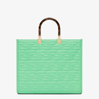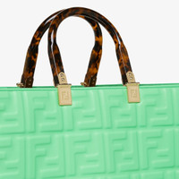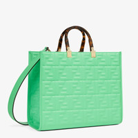 Medium Sunshine Shopper bag made of green leather with raised 3D-texture FF motif and rigid tortoiseshell-effect plexiglass handles. Features a spacious lined internal compartment, edges in tone on tone leather, and gold-finish metalware. Can be carried by hand or worn on the shoulder thanks to the two handles and detachable shoulder strap. Made in Italy Composition: 100% calf leather, inside: 90% polyester, 10% polyurethane Model height: null Size worn: null Measurements: - Height : 31 cm - Depth : 17 cm - Width : 35 cm Product Code: 8BH386AMCVF1K3D