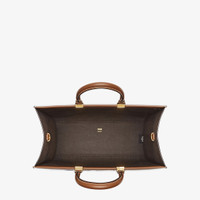 Medium Sunshine bag, a roomy, versatile city shopper that stands out thanks to its linear design and sophisticated details. Made of natural-colored and brown raffia in crochet creating the Pequin striped motif. Brown leather “Fendi Roma” lettering applied with hand stitching and brown leather tubular handles. Featuring a spacious lined internal compartment, brown leather profiles and gold-finish metalware. Can be carried by hand or worn on the shoulder thanks to the two handles and detachable shoulder strap. Made in Italy Measurements: - Height : 31 cm - Depth : 17 cm - Width : 35 cm - Weight : 1.09 kg - Strap length (min) : 90 cm - Strap length (max) : 90 cm - Shoulder strap drop : 40 cm Composition: 90% polyester, 10% viscose, 100% calf leather, inside: 60% polyamide, 40% polyurethane Product Code: 8BH386AS3WF1PII