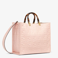 Medium Sunshine Shopper bag made of pink leather with raised 3D-texture FF motif and rigid tortoiseshell-effect plexiglass handles. Features a spacious lined internal compartment, edges in tone on tone leather, and gold-finish metalware. Can be carried by hand or worn on the shoulder thanks to the two handles and detachable shoulder strap. Made in Italy Composition: 100% calf leather, inside: 90% polyester, 10% polyurethane Model height: null Size worn: null Measurements: - Height : 31 cm - Depth : 17 cm - Width : 35 cm Product Code: 8BH386AMCVF0J2F