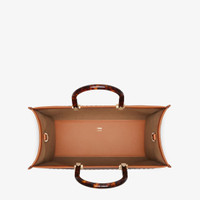 Medium Sunshine Shopper bag made from brown leather with heat-stamped “FENDI ROMA” and stiff tortoiseshell plexiglass handles. Equipped with a spacious lined internal compartment, edges in tone on tone leather, and gold-finish metalware. Can be carried by hand or worn on the shoulder thanks to the two handles and detachable shoulder strap. Made in Italy Measurements: - Height : 31 cm - Depth : 17 cm - Width : 35 cm - Weight : 1.2 kg - Strap length (min) : 90 cm - Strap length (max) : 90 cm - Shoulder strap drop : 42 cm Composition: 100% calfskin, 100% polymethyl methacrylate, inside: 60% polyamide, 40% polyurethane Product Code: 8BH386ABVLF0PWZ