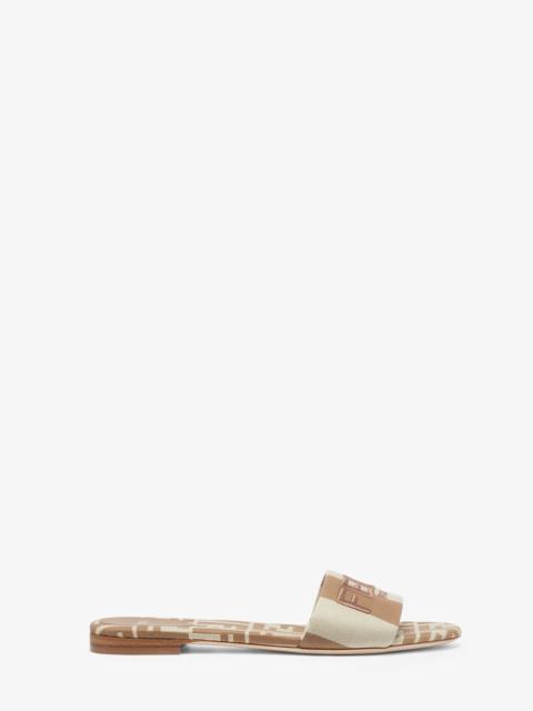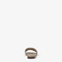 Wide-band slides. Made of denim-effect jacquard with Pequin stripes in dove gray and white. Denim-effect FF jacquard FF insole in the same tones. Dove gray yarn Fendi Roma embroidery. 10 mm (0.4 inch) heel. Made in Italy Composition: 100% cotton, inside: 100% calf leather Product Code: 8R8092ASB5F1STE