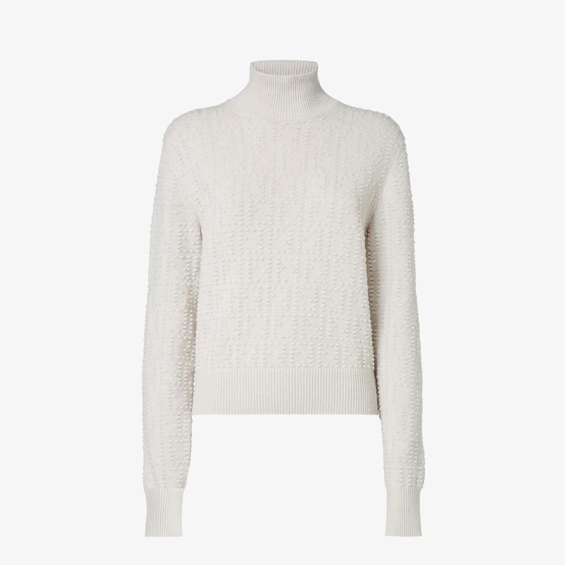 High neck sweater with long sleeves, finished with ribbed edges. Made of light gray wool and cashmere with a tone-on-tone FF motif, interpreted with a polka dot embroidery that creates a slightly raised texture. Made in Italy Composition: 70% wool, 30% cashmere Size worn: 38 IT. The model is 178 cm tall Product Code: FZXE09AYM0F16A8