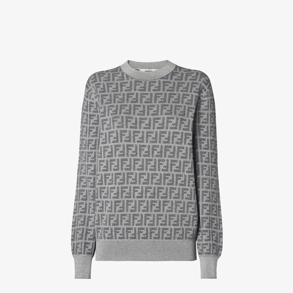 Long-sleeved boxy sweater with round neck. Made of jacquard fabric with the iconic, diagonal FF motif with denim effect. Trimmed with solid-colored ribbed edges. Made in Italy Composition: 70% wool, 30% silk Size worn: 38 IT. The model is 180 cm tall Product Code: FZXE39AYM1F1UPW
