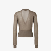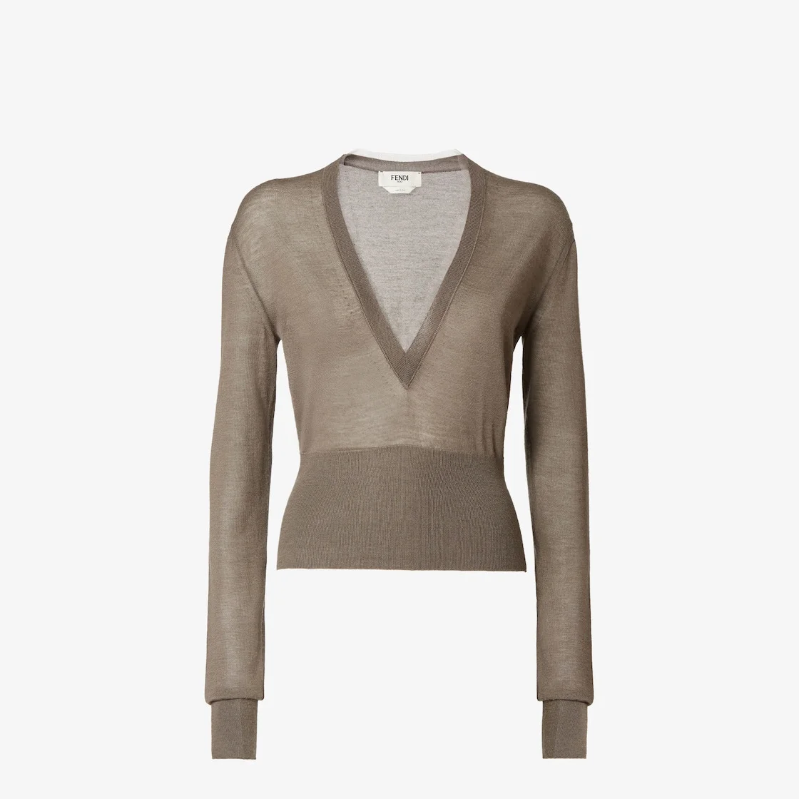 Long-sleeved sweater with a deep V-neck. Made of a lightweight gray cashmere and silk knit. Finished with a high waistband and ribbed edges. Made in Italy Composition: 70% cashmere, 30% silk Size worn: 38 IT. The model is 180 cm tall Product Code: FZXD69AUZSF1T6W
