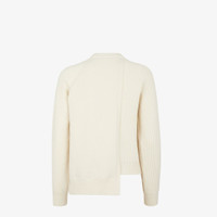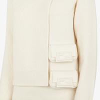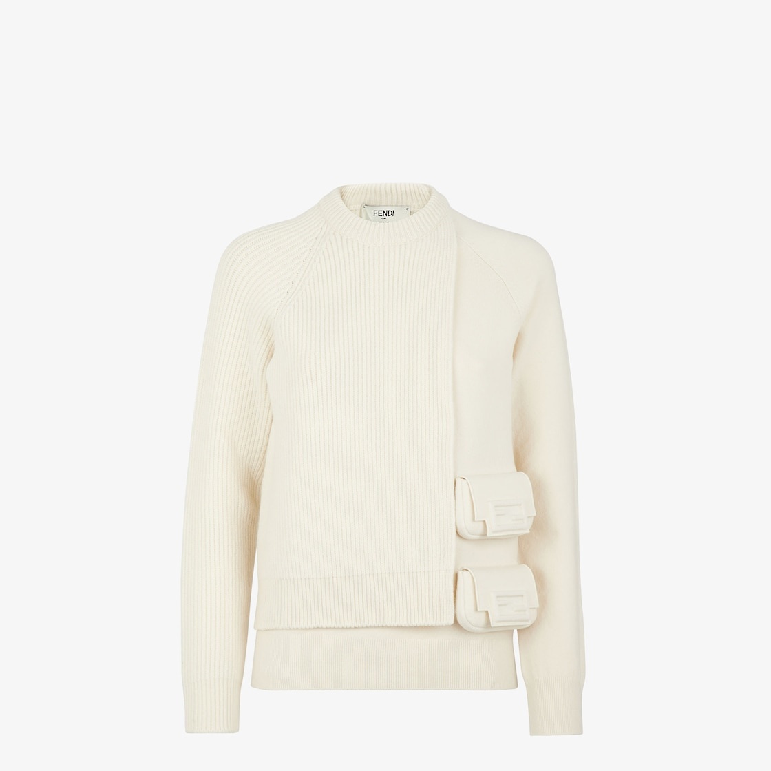 Crew neck sweater with raglan sleeves and asymmetric hem. Ribbed edges. Made of pearly white cashmere and wool and features a double-sided knit with stockinette stitch and English rib for a multi-layered effect. Decorated with two cashmere Baguette mini-bags in the same colors applied on the hem. Made in Italy Composition: 65% Wool, 28% Cashemere, 6% Polyamide, 1% Polyurethane Model height: 179 cm Size worn: 38 IT Product Code: FZX879AMDAF1J7C