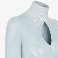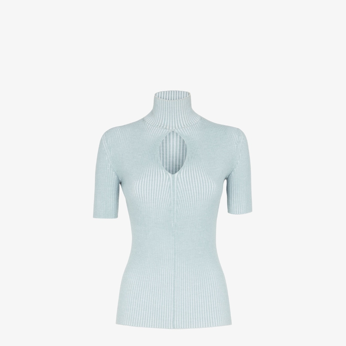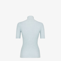 Figure-hugging sweater with a high collar and short sleeves. Cut-out detail at the neckline. Made of a blend of wool and viscose. The ribbing in light blue and white creates movement and accentuates the elasticity of the texture. Embellished with matching embroidered Fendi Roma logo on the left side. Made in Italy Composition: 100% wool Size worn: 38 IT. The model is 177 cm tall Product Code: FZXA57ARV9F08S8