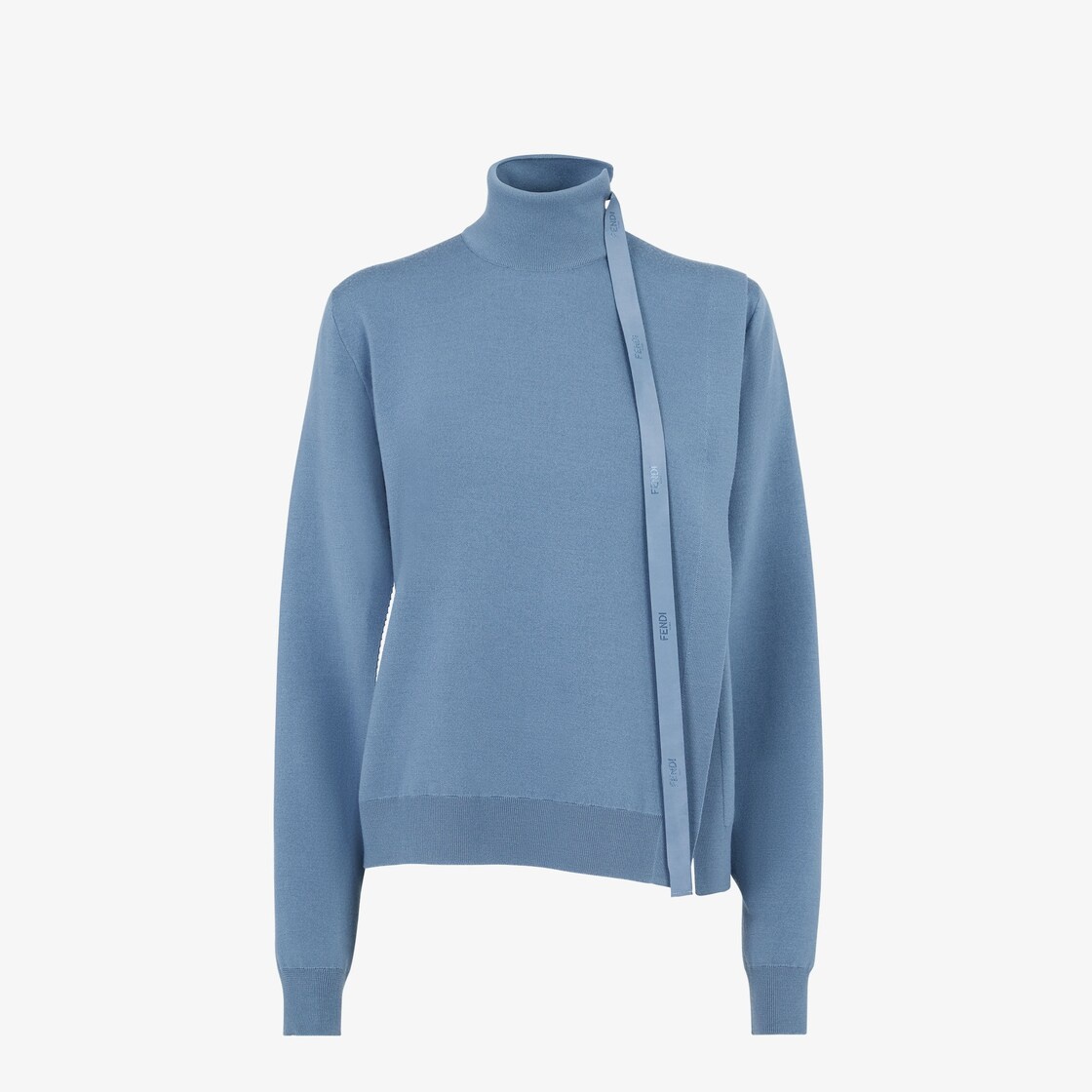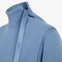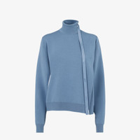 Relaxed-fit sweater with high collar. Made of powder blue wool, featuring deep cut-out details on the sleeve underside and an asymmetrical slit at the front. The collar is embellished with a small slit closed with matching-color satin logo ties in satin. Made in Italy Composition: 100% wool Model height: 178 cm Size worn: 38 IT Product Code: FZX972ANJKF1KE5