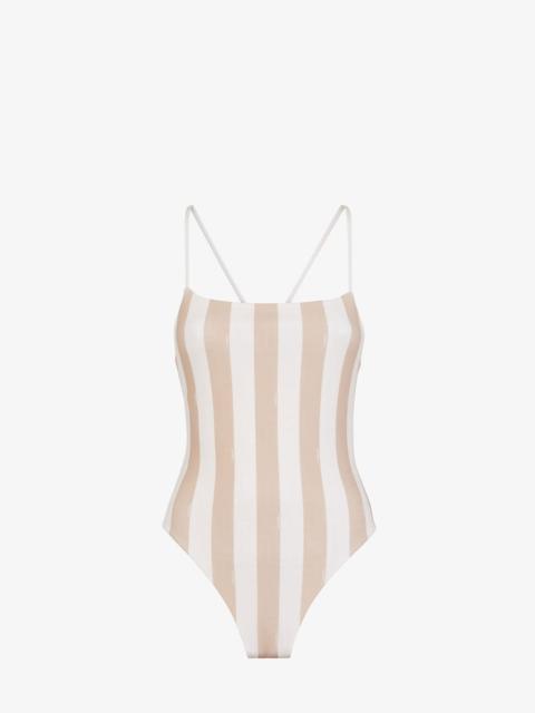 Reversible one-piece swimsuit with a straight neckline and crossover shoulder straps on the back. Made of Lycra® with iconic brown Pequin stripes. FF lining in the same colors. Made in Italy Composition: 82% polyamide, 18% elastane, lining: 82% polyamide, 18% elastane Product Code: FXBA27AQBYF13IZ