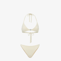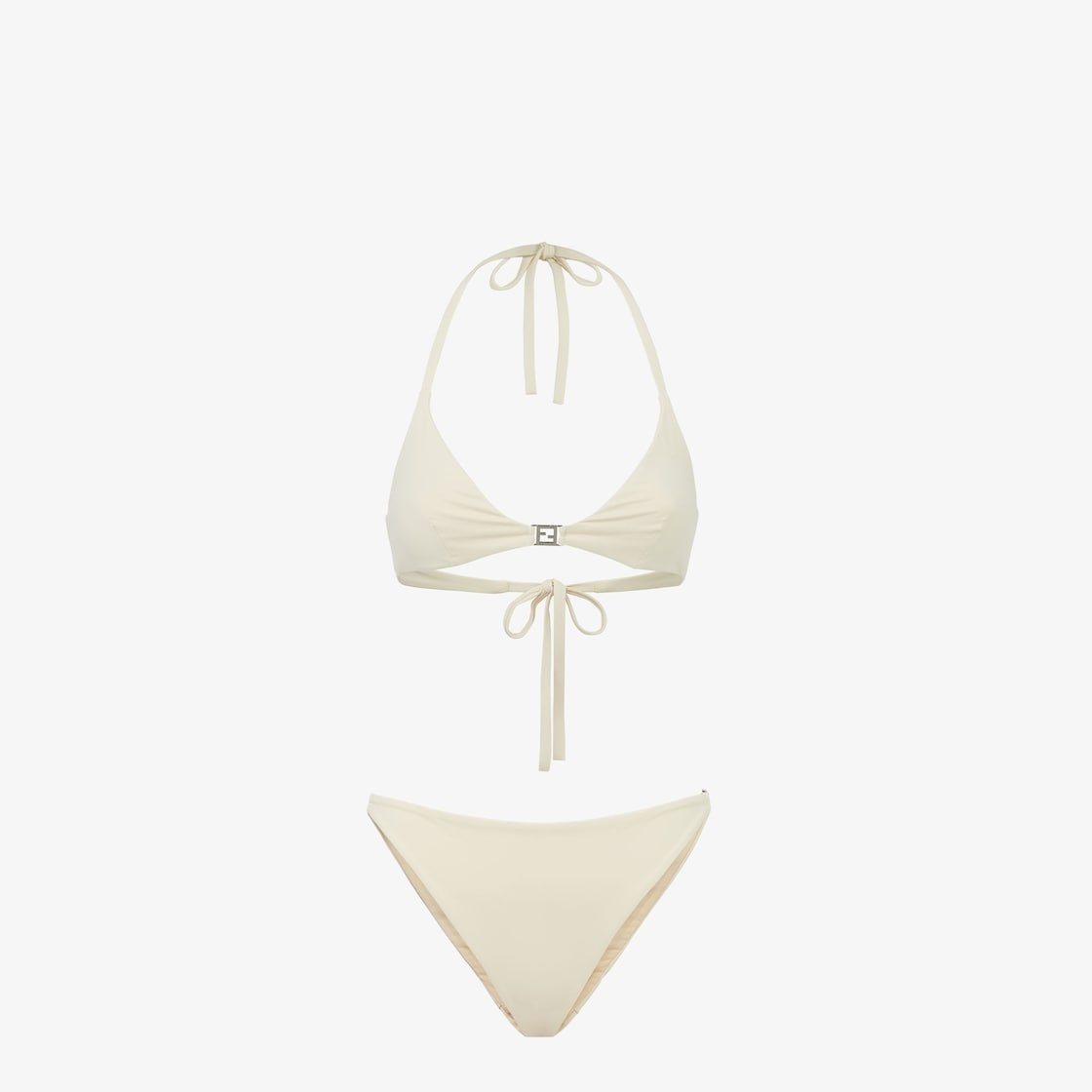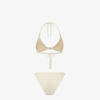 Two-piece swimwear with triangle bra and tanga briefs. Made of shiny light beige Lycra®. Embellished with ruthenium-finish metal FF detail on the front. Lining with all-over FF motif. Matching FF Baguette mini pouch. Made in Italy Composition: 80% Polyamide, 20% Elastane, lining: 92% Polyamide, 8% Elastane Product Code: FXBH60AK90F084J
