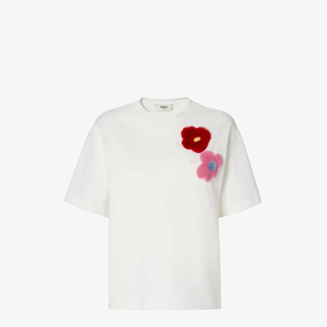 Regular-fit T-shirt with crew neck and short sleeves. Made of white cotton jersey. Decorated with pink and red mink Sunny Side Flowers brooch pins on the chest. Embellished with a small Fendi Roma logo embroidered on the chest. Made in Italy Composition: 100% cotton, 100% mink fur parts Product Code: FS9776AOUHF0ZNM