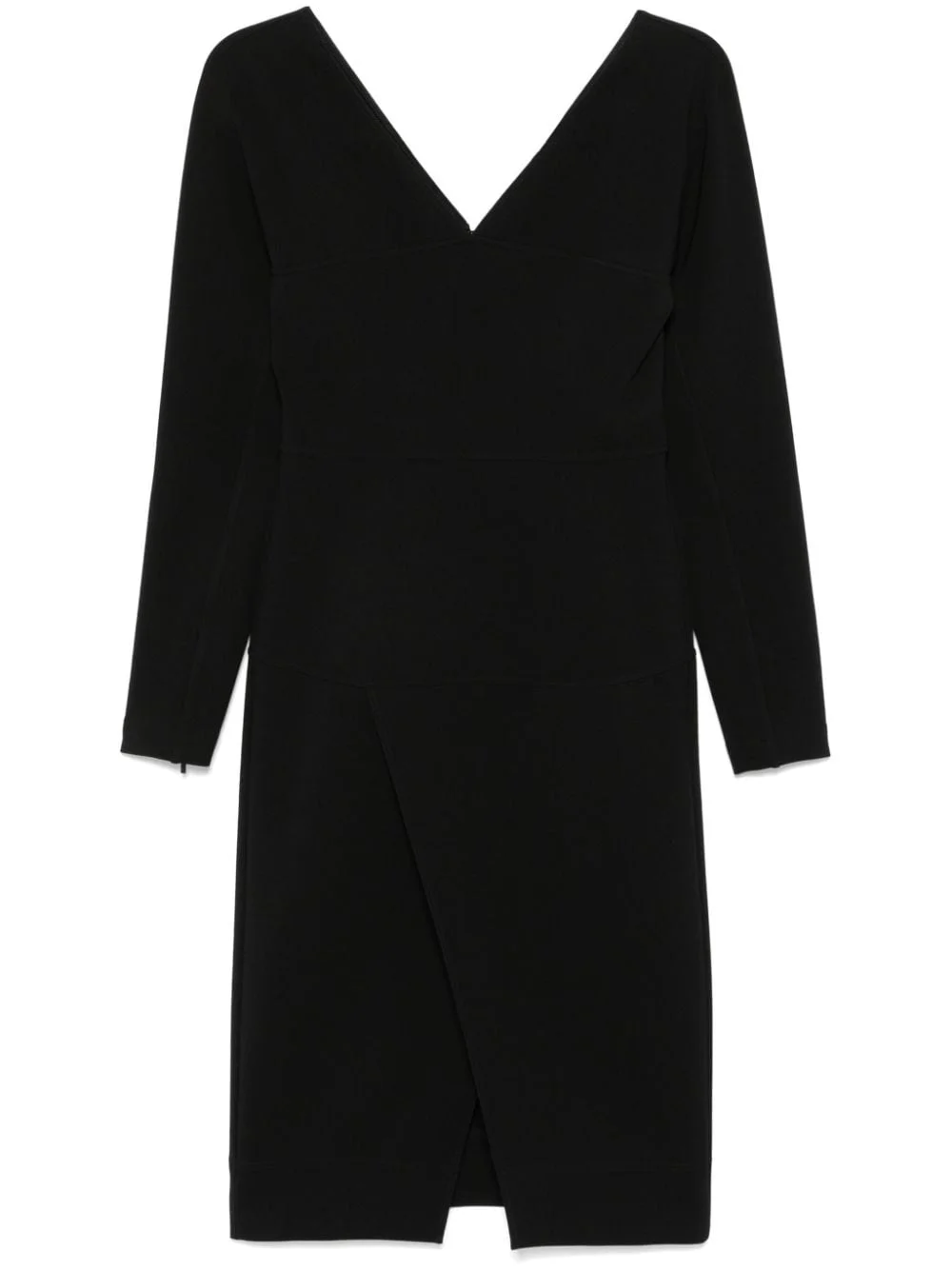 long-sleeve midi dress Highlights - Black - Stretch-jersey - Concealed rear hook and zip fastening - V-neck - Long sleeves - Cuff zips - Fitted waistline - Front slit - V-back - Unlined - Straight hem - Mid-length Made in Italy Composition Viscose 75%, Polyamide 17%, Elastane 8% SIZE & FIT Model measurements Height 5 ft 11 in(1.8 m) Bust/Chest 32.67 in(83 cm) Hips 35.82 in(91 cm) Waist 25.98 in(66 cm) FittingInformation Designed for a slim fit that sits just away from the body offering a close yet comfortable fit Made from a midweight stretch fabric, this piece offers elasticity and flexibility when worn