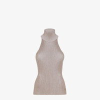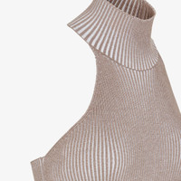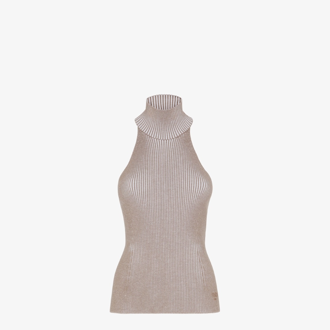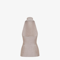 Fitted sleeveless top. Halter neck with bare back and high neck. Made of a blend of dove gray wool and viscose. The ribbing creates movement and accentuates the elasticity of the texture. Embellished with matching embroidered Fendi Roma logo on the left side. Made in Italy Composition: 100% wool Size worn: 38 IT. The model is 175 cm tall Product Code: FZXB75ARV9F0U6W