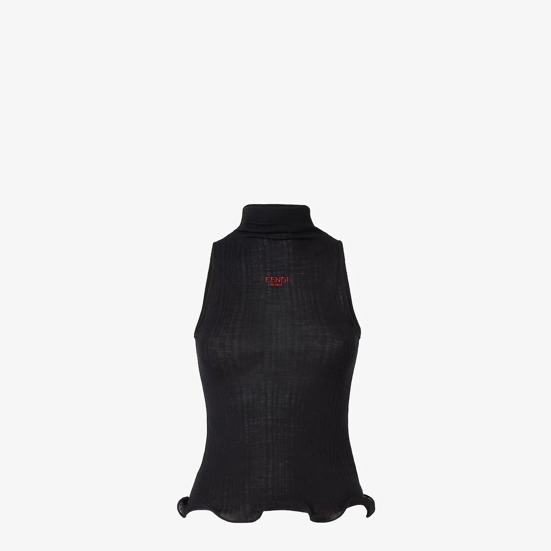 Sleeveless top with a fitted silhouette and high neck. Made of black cotton jersey with ribbed detailing. Finished with ruffles at the hem and Fendi Roma lettering embroidered on the chest in red. Made in Italy Composition: 100% cotton Product Code: FS9740AVFEF0GME