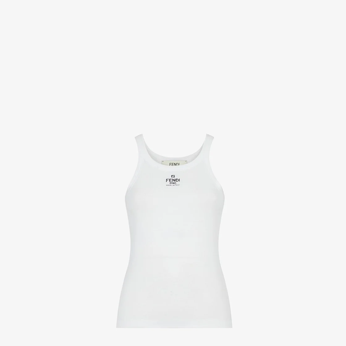 Slim-fit sleeveless top. Made of white cotton jersey with a rib knit. Decorated with an embroidered Fendi Roma logo on the front in black. Made in Italy Composition: 94% Cotton, 6% Elastane Fit: Slim Size worn: 38 IT. The model is 182 cm tall Product Code: FS7966ANQMF0ZNM