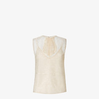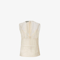 Crew neck sleeveless top. Tear-drop closure with small button at the back. Made of light pink lace. Finished with trimming details and tone-on-tone lace jabot motif on the front. Matching silk slip top with thin shoulder straps and V-neckline. Made in Italy Composition: 51% viscose, 49% polyamide, 100% polyamide, lining: 100% silk, 2 buttons: mother of pearl Size worn: 38 IT. The model is 178 cm tall Product Code: FS8301AVJJF1M2A