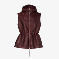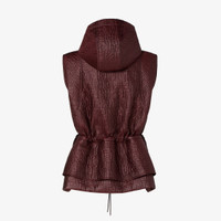 Vest with hood and side zipper pockets. Drawstring waist and peplum over the hips for a double layer effect. Zipper closure with double slider. Made of burgundy technical fabric with lightly padded and quilted with the FF motif all over. Palladium-finish metalware. Made in Italy Composition: 100% polyester Product Code: FAN239AT9CF1UKF