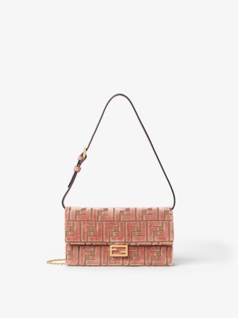 Compact Baguette wallet with flap and FF clasp. Interior compartment with six card slots. Double shoulder strap, an adjustable leather option and a detachable thin chain option: to carry the bag like a clutch, under the arm or wear it cross-body. Made of jacquard velvet with a raised FF motif in matcha green on a beige base. Matcha green leather lining. Gold-finish metalware. Made in Italy Composition: 39% polyester, 35% cotton, 25% viscose, 1% other fibers, 100% calf leather, inside: 96% viscose, 4% acrylic Product Code: 8M0498AT14F1SK5