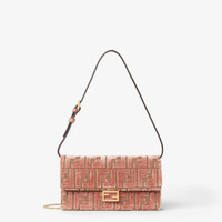 Compact Baguette wallet with flap and FF clasp. Interior compartment with six card slots. Double shoulder strap, an adjustable leather option and a detachable thin chain option: to carry the bag like a clutch, under the arm or wear it cross-body. Made of jacquard velvet with the embossed FF motif in pink on a beige base. Pink leather lining. Gold-finish metalware. Made in Italy Composition: 39% polyester, 35% cotton, 25% viscose, 1% other fibers, 100% calf leather, inside: 96% viscose, 4% acrylic Product Code: 8M0498AT14F13VM