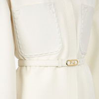 Single-breasted Go-To Jacket with shirt collar and low-cut set-in sleeves. Matching belt with metal Fendi O’Lock buckle. Oversized patch pockets on the chest. Made of white wool and silk. The leather pockets are trimmed with an embossed Selleria stitching motif. Made in Italy Composition: 77% wool, 23% silk, lining: 100% viscose, sleeve lining:100% silk, belt 100% silk, 100% brass, 67% polyester, 33% polyurethane, pockets 100% lamb leather Fit: Oversized, We suggest selecting a size down Size worn: 38 IT. The model is 180 cm tall Product Code: FJ7262AC4GF0ZNM