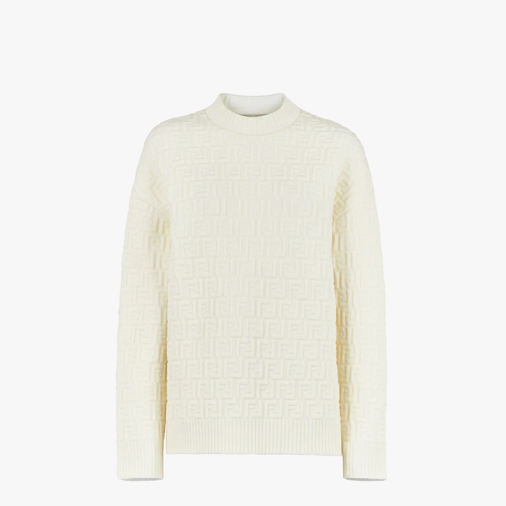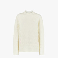 Slightly oversized pullover with low-cut set-in sleeve. Ribbed finish on neckline, cuffs and hem. Made of white viscose knit with embossed all-over FF motif. Made in Italy Composition: 51%viscose, 21%polypropylebe, 18%polyester, 9%polyamide, 1%elastane Product Code: FZX810AJTEF0ZNM