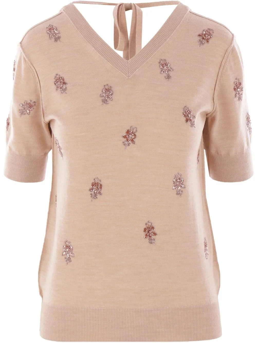 wool cropped sweater Highlights - Blush beige - Rear tie fastening - Crystal embellishment - Ribbed trim - Short sleeves Made in Italy Composition Virgin Wool 98%, Spandex/Elastane 2%
