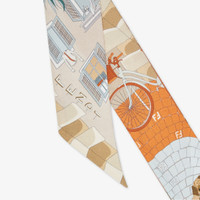 Two-sided wrappy. Can be worn around the neck, knotted at the wrist or used to accessorize a bag with a touch of color. Made of silk with the “Walking around Rome” motif, inspired by the historic districts of Rome. A graphic design that blends iconic brand elements with nods to tradition, featuring a mix of orange, green and beige tones. Made in Italy Composition: 100% silk Product Code: FXT011AUMAF1FU2