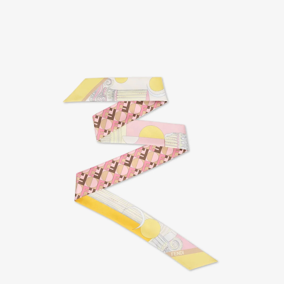 Two-sided wrappy. Can be worn around the neck, knotted at the wrist or used to accessorize a bag with a touch of color. One side is decorated with the Moonlight Echoes print in pink and yellow, reinterpreting motifs inspired by Roman mosaics and Art Deco, including columns, moons and suspended spheres: a tribute to Fendi’s heritage and the dialogue between history and modernity. The other side is customized with the Fendi Optical motif in the same shades. Made in Italy Composition: 100% silk Product Code: FXT011AYL8F0B8Y