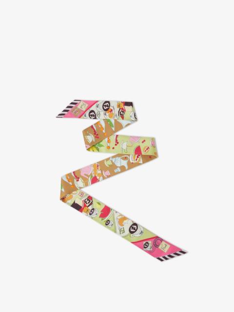 Two-sided wrappy. Can be worn around the neck, knotted at the wrist or used to accessorize a bag with a touch of color. Made of multicolor silk. The Fendi Fortunes motif, printed on both sides, depicts a journey through the alleyways and doorways of Rome. A tribute to the city’s hidden mystique, where every doorway opens onto an unexpected world. Made in Italy Composition: 100% silk Product Code: FXT011B027F1WSE