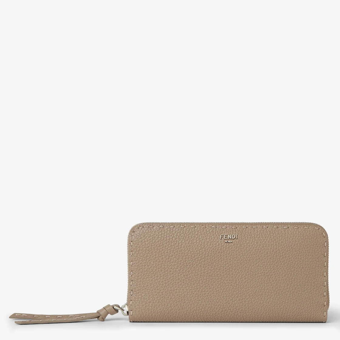 Large Peekaboo wallet with zipper fastening along three sides. Interior with two gusseted compartments, eight card slots and central zipped pocket. Made of dove gray Cuoio Romano leather, with 160 hand-sewn topstitches, an emblem of the iconic Selleria stitching handed down through generations of Fendi artisans since 1925. Palladium-finish metalware and metal FENDI logo. Made in Italy Composition: 100% calf leather, inside: 100% sheep leather Product Code: 8M0517ARC1F04Y9