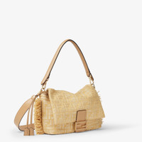 Iconic medium Mamma Baguette bag, created in the late 1990s as a larger version of the iconic Baguette, hence the name Mamma Baguette. Updated for the Spring/Summer 2025 fashion show with a soft, deconstructed look, it retains the original elements of the bag and the iconic under-the-arm design. Made of natural-color jacquard fabric with the iconic FF motif in viscose raffia. Decorated with fringes along the edges. FF clasp with beige leather insert. Large tone-on-tone lined internal compartment, with drawstring closure with beige leather laces and customized details. Featuring a front flap and magnetic clasp. Gold-finish metalware. The bag can be worn either on the shoulder or cross-body thanks to the beige calfskin handle and shoulder strap, both detachable. Made in Italy Composition: 77% cotton, 23% polyamide, 100% lamb leather, inside: 100% cotton Product Code: 8BR833AV5JF17A1