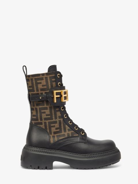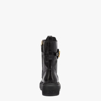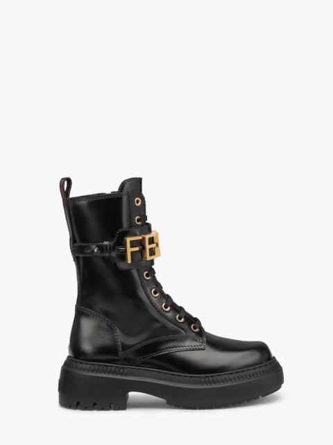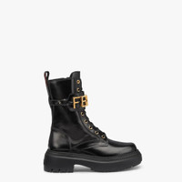 Round toe combat boots closed with laces and Fendi lettering strap. Made of black leather. Gold-finish metalware. Made in Italy Measurements: - Heel height : 50 mm Composition: 100% Calfskin, interior: 100% Lambskin Product Code: 8T8355AKY6F1H1K
